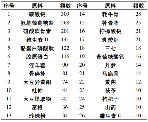 增加骨密度保健食品的原料使用頻數(shù)≥10的原料