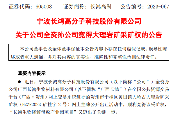 廣西長鴻高科以1.398億元取得大理巖礦采礦權(quán)
