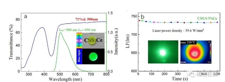 (a)CSS:Ce青綠熒光透明陶瓷的發(fā)射光譜,透過(guò)光譜和在日光和藍(lán)光下的圖片;(b)高密度藍(lán)色激光激發(fā)下,流明通量隨時(shí)間的穩(wěn)定輸出,高亮度青綠熒光圖片,陶瓷片溫度分布圖,最高為239℃,耐熱性能優(yōu)良。
