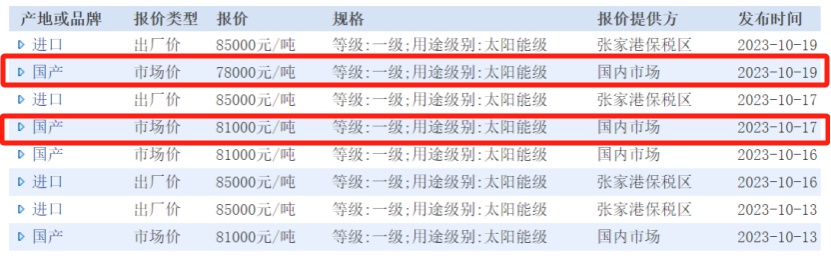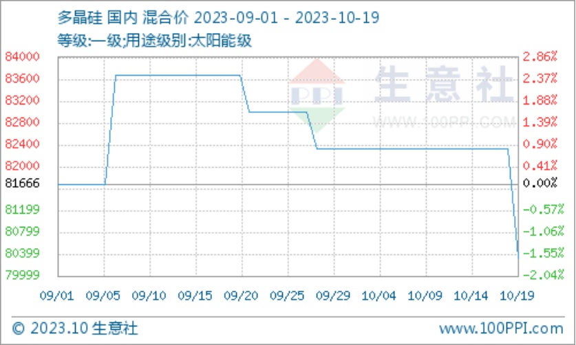 中國粉體網(wǎng)訊 10月19日,生意社公布最新多晶硅報價,最新價格顯示,硅料價格78000元/噸,相較10月17日81000降價3000元/噸,來到8000元以下。
