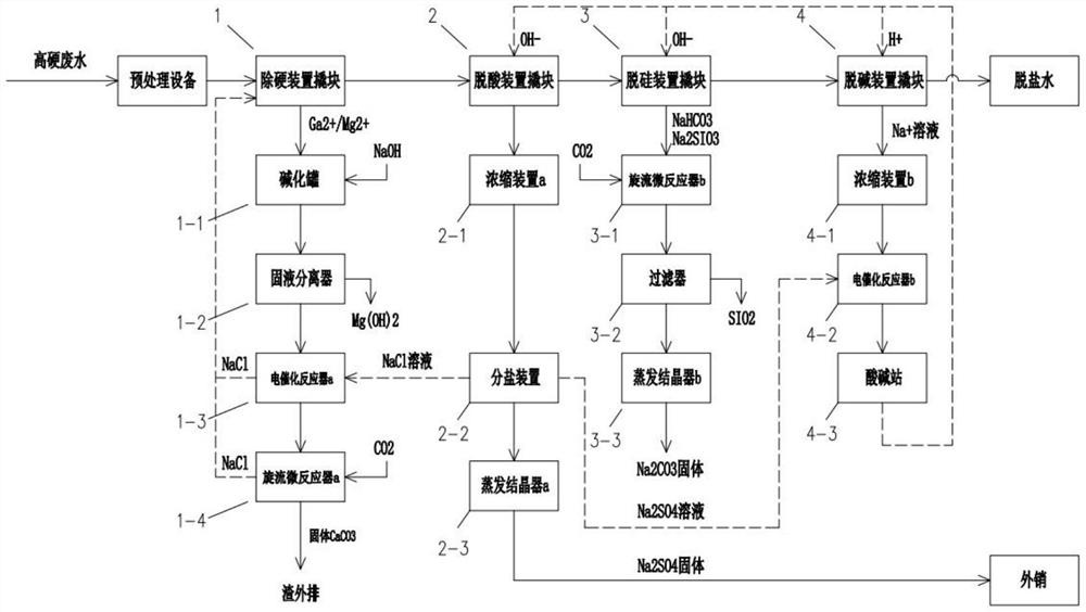 本發(fā)明是一種耦合工藝,前端柱粒微反應(yīng)工藝是后端原位制堿的條件,后端原位制堿的產(chǎn)物是前端柱粒微反應(yīng)器的沉淀劑,能有效解決常規(guī)零排放瓶頸難題。本發(fā)明具有以下顯著特點,無需額外的預(yù)處理裝置,無需外加酸堿,不外加藥劑,運行壓力低,抗污染,檢修方便,適用水質(zhì)寬,出水水質(zhì)穩(wěn)定,占地面積小。