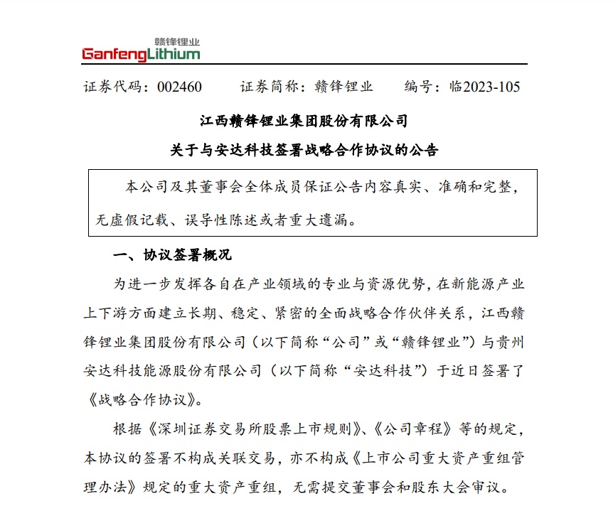 10月16日,贛鋒鋰業(yè)發(fā)布公告稱,公司與貴州安達科技能源股份有限公司(簡稱“安達科技”)于近日簽署了《戰(zhàn)略合作協(xié)議》。公告顯示,雙方將開展多領(lǐng)域合作,在鋰鹽產(chǎn)品供應(yīng)方面開展供應(yīng)鏈深度合作;在磷酸鐵鋰正極產(chǎn)品供應(yīng)方面開展供應(yīng)鏈深度合作;拓展鋰鹽產(chǎn)品的應(yīng)用領(lǐng)域,在新產(chǎn)品開發(fā)、應(yīng)用研究等領(lǐng)域開展合作。同時,為進一步提升雙方的產(chǎn)業(yè)競爭力,贛鋒鋰業(yè)和安達科技基于各自的產(chǎn)業(yè)優(yōu)勢,擬共同成立合資公司以投資建設(shè)年產(chǎn)2萬噸磷酸鐵鋰正極材料制造項目。合資公司注冊資本5000萬元人民幣,贛鋒鋰業(yè)持股40%,安達科技持股60%。