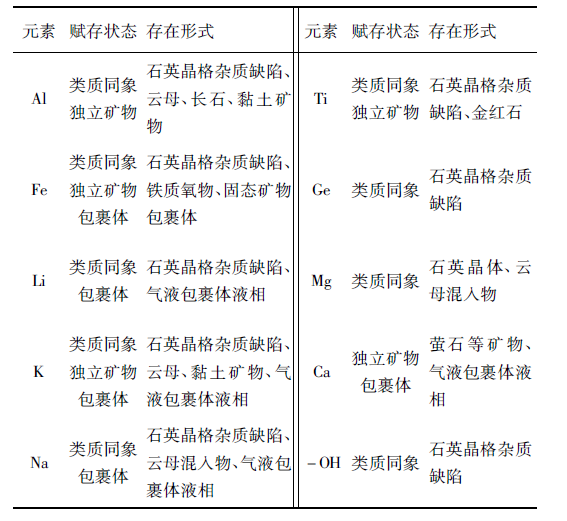 石英中礦物伴生雜質根據其大小、賦存形式等特性可分為三類:脈石礦物類雜質、流體包裹體類雜質、晶格結構雜質。