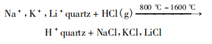 氯化焙燒是在低于石英熔點溫度下,石英中的雜質組分與氯化劑作用轉變?yōu)槁然锒鴵]發(fā)出來,石英在高溫氯化焙燒過程中存在晶型轉變,使得石英晶格中的金屬離子可能會遷移擴散到石英表面,與HCl、NH4Cl和Cl2等發(fā)生化學反應變成易揮發(fā)組分而實現與石英的分離,同時也阻止了雜質元素在冷卻過程再遷移擴散至石英晶格中。石英晶格中堿金屬雜質在HCl氣氛中焙燒時會發(fā)生如下化學反應: