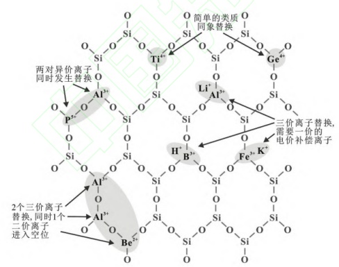 ♦電荷補償替代:如Al3+、Fe3+替代Si4+形成了[AlO4/M+]0或[FeO4/M+]0結構中心,M+充當電價補償離子平衡電荷。一般為堿金屬離子,有時也可以為正2價離子(Be2+、B2+、Rb2+、Sr2+、Ba2+)。