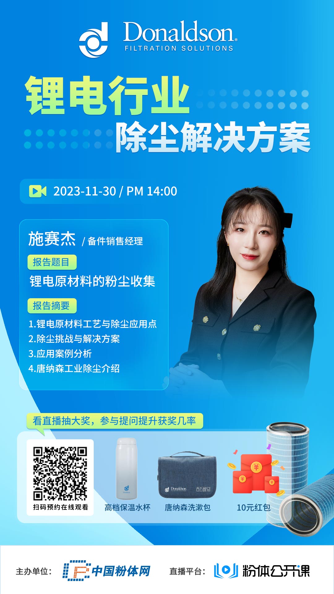 粉體公開(kāi)課聯(lián)合唐納森共同舉辦此次會(huì)議,探討鋰電原材料的粉塵收集!歡迎大家掃碼預(yù)約觀看!
