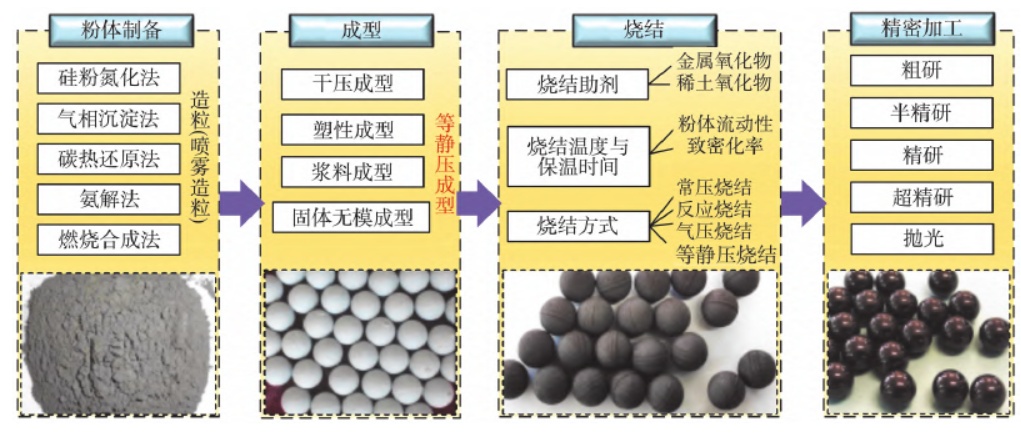 軸承級陶瓷材料主要包括氮化硅(Si3N4)、氧化鋯(ZrO2)、氧化鋁(Al2O3)等,其中Si3N4是目前陶瓷球軸承使用的標(biāo)準(zhǔn)材料。氮化硅陶瓷材料與高溫軸承鋼及其它陶瓷材料相比更具有優(yōu)異的特性,主要用于數(shù)控機床、高速精密機械中。作為一種特殊的陶瓷材料,Si3N4陶瓷制備工藝復(fù)雜,制備過程包括粉體制備、成型、燒結(jié)、精密加工等。
