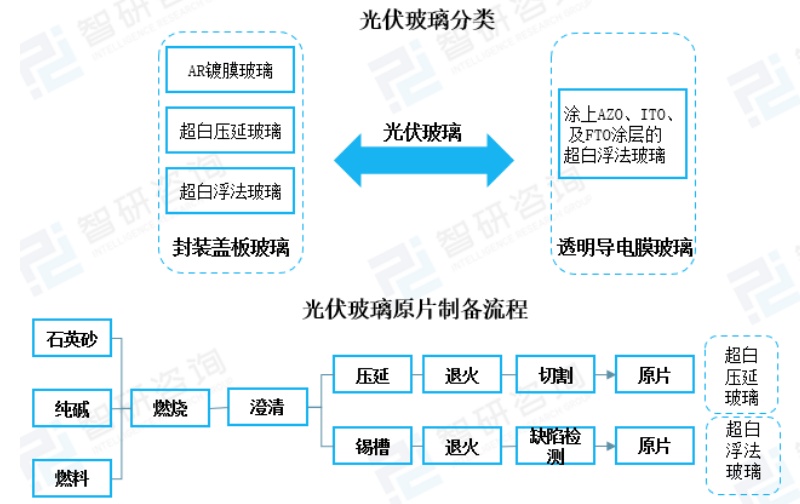 根據(jù)應(yīng)用對(duì)象的不同可以分為封裝蓋板玻璃和透明導(dǎo)電膜玻璃。封裝蓋板玻璃是用于晶硅電池組裝中,透明導(dǎo)電膜玻璃則是用于薄膜太陽(yáng)電池的組裝。封裝蓋板玻璃可細(xì)分為AR鍍膜玻璃、超白壓延玻璃、超白浮法玻璃。薄膜太陽(yáng)電池的透明導(dǎo)電膜玻璃則主要是涂上AZO、ITO、及FTO涂層的超白浮法玻璃。