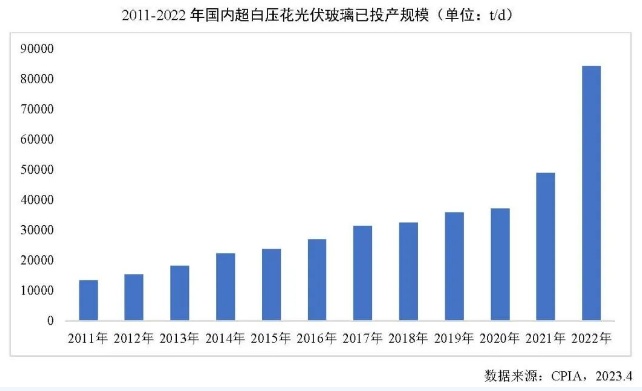 據(jù)工信部數(shù)據(jù)顯示,2022年中國(guó)伏壓延玻璃在產(chǎn)企業(yè)40家,共計(jì)128窯442條產(chǎn)線,光伏壓延玻璃產(chǎn)能達(dá)8.4萬(wàn)噸/天,同比增長(zhǎng)71.4%;光伏壓延玻璃累計(jì)產(chǎn)量1,606.2萬(wàn)噸,同比增長(zhǎng)53.6%。截至2023年7月底,國(guó)內(nèi)光伏玻璃在產(chǎn)產(chǎn)能升至9.1萬(wàn)噸/天,總窯爐座數(shù)為132座,產(chǎn)線為488條。其中,在產(chǎn)窯爐112座,在產(chǎn)產(chǎn)線444條,冷修窯爐20座,光伏玻璃企業(yè)開(kāi)工率為81.14%,產(chǎn)能利用率為93.85%。