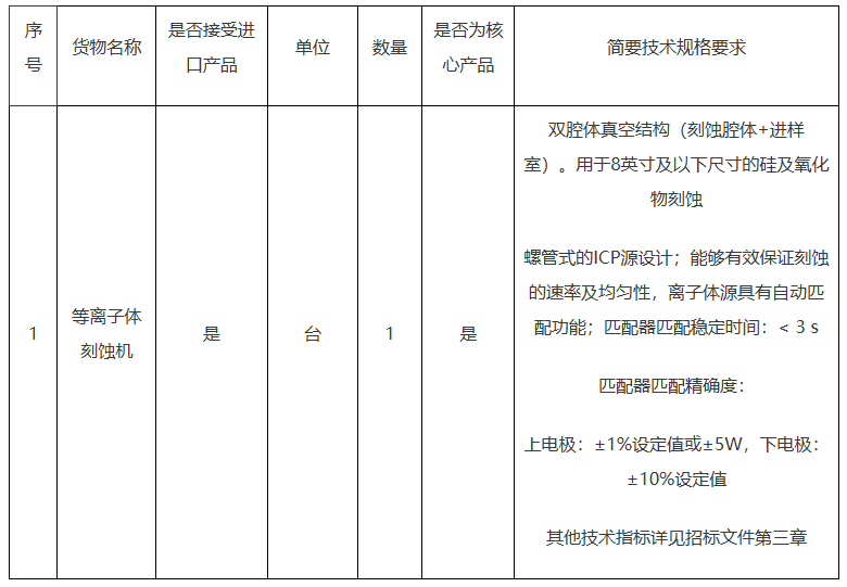華中科技大學(xué)擬采購等離子體刻蝕機(jī)1臺(tái)。采購清單如下,其他具體內(nèi)容詳見第三章技術(shù)、服務(wù)及商務(wù)要求。