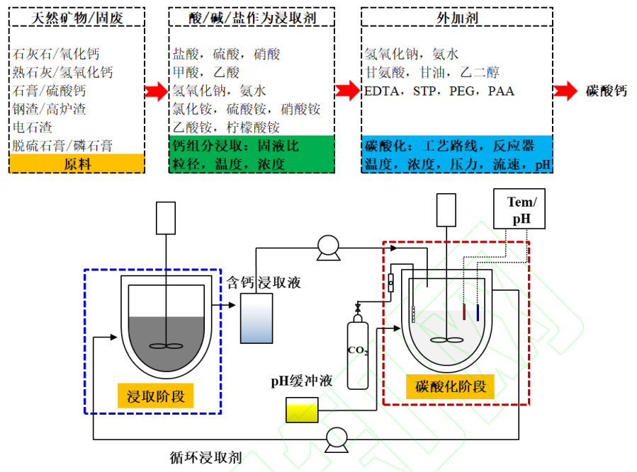 中科院過(guò)程所開(kāi)展了CO2間接礦化鋼渣制備微細(xì)碳酸鈣關(guān)鍵技術(shù)與工程化示范,通過(guò)醋酸等弱酸介質(zhì)形成多相復(fù)合介質(zhì)預(yù)處理鋼渣,浸取鋼渣中有效鈣組分,采用加壓碳酸化將鋼渣浸取液中的鈣組分轉(zhuǎn)化為高品質(zhì)碳酸鈣產(chǎn)品,并同步回收多相復(fù)合反應(yīng)介質(zhì)。