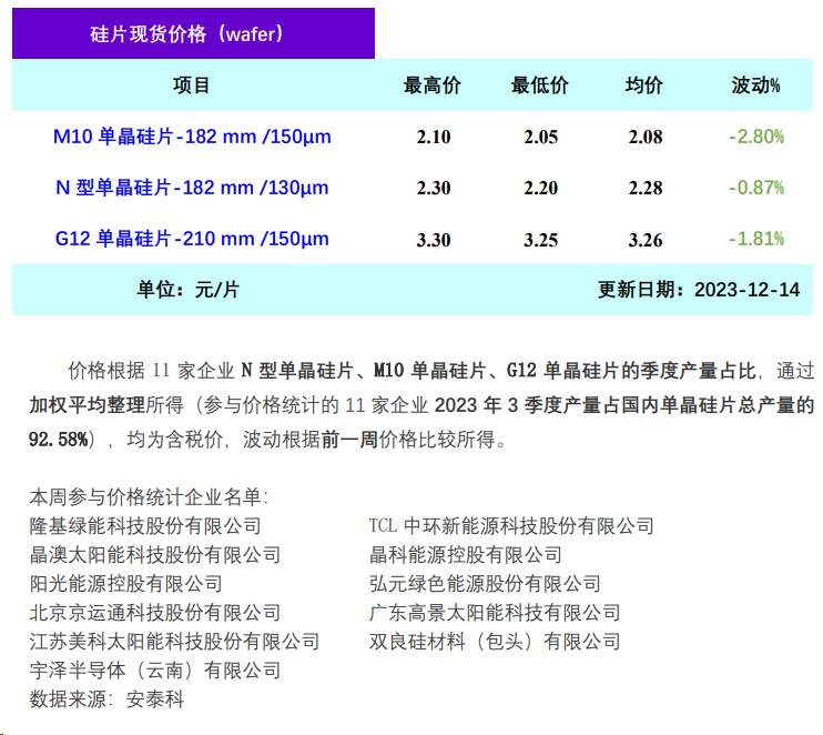 中國粉體網(wǎng)訊 據(jù)中國有色金屬工業(yè)協(xié)會(huì)硅業(yè)分會(huì)12月14日消息,本周硅片市場價(jià)格維持跌勢。M10單晶硅片(182 mm /150μm)成交均價(jià)降至2.08元/片,周環(huán)比降幅2.8%;N型單晶硅片(182 mm /130μm)成交均價(jià)降至2.28元/片,周環(huán)比降幅0.87%;G12單晶硅片(210 mm/150μm)成交均價(jià)降至3.26元/片,周環(huán)比降幅1.81%,N型硅片價(jià)格相對P型有所支撐。