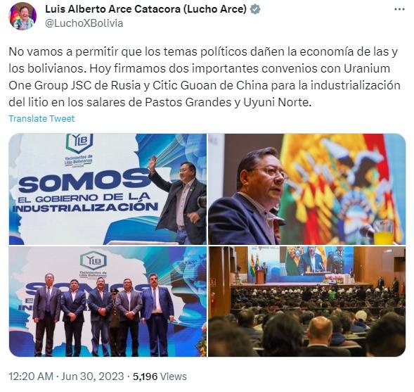 此外,玻利維亞總統(tǒng)阿爾塞6月29日在推特發(fā)文稱,玻利維亞方面當(dāng)日同俄羅斯國(guó)家原子能集團(tuán)旗下國(guó)際鈾礦控股公司Uranium One Group和中國(guó)中信國(guó)安集團(tuán)簽署兩項(xiàng)重要協(xié)議,用于大帕斯托斯和烏尤尼鹽灘的鋰產(chǎn)業(yè)化項(xiàng)目。