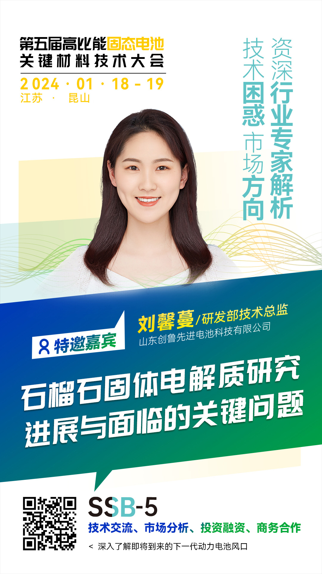 針對固態(tài)電池相關(guān)的技術(shù)、材料、市場及產(chǎn)業(yè)等方面的問題,中國粉體網(wǎng)將在昆山舉辦第五屆高比能固態(tài)電池關(guān)鍵材料技術(shù)大會。為致力于固態(tài)電池技術(shù)開發(fā)的企業(yè),科研院校,以及電動車、儲能、特種應(yīng)用等終端企業(yè)提供信息交流的平臺,開展產(chǎn)、學(xué)、研合作,共同推動行業(yè)發(fā)展。屆時,山東創(chuàng)魯先進(jìn)電池科技有限公司研發(fā)部技術(shù)總監(jiān)劉馨蔓將作題為《石榴石固體電解質(zhì)研究進(jìn)展與面臨的關(guān)鍵問題》的報告。報告將對其團隊在石榴石固體電解質(zhì)研究進(jìn)展以及研發(fā)過程中遇到的關(guān)鍵問題展開介紹。