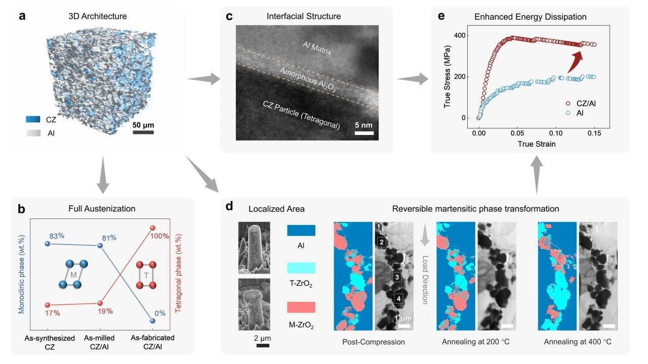 圖1 可逆相變陶瓷誘導(dǎo)高能耗金屬基復(fù)合材料(CZ/Al)原理圖。(a)高分辨率X射線顯微成像(XRM)的三維結(jié)構(gòu)。(b)復(fù)合材料的相組成,其中T和M分別代表四方(奧氏體)和單斜(馬氏體)結(jié)構(gòu)。(c)復(fù)合界面的高分辨透射電子顯微鏡(TEM)圖像。(d)復(fù)合材料局部區(qū)域的微柱壓縮前后形貌照片,以及TEM樣品切片在壓縮后(25℃)、200℃和400℃退火后的旋進(jìn)電子衍射(PED)明場圖像和對應(yīng)的相組成圖。壓縮方向(從上到下)由箭頭指示。(e)復(fù)合材料與純鋁壓縮過程的真應(yīng)力-真應(yīng)變曲線。