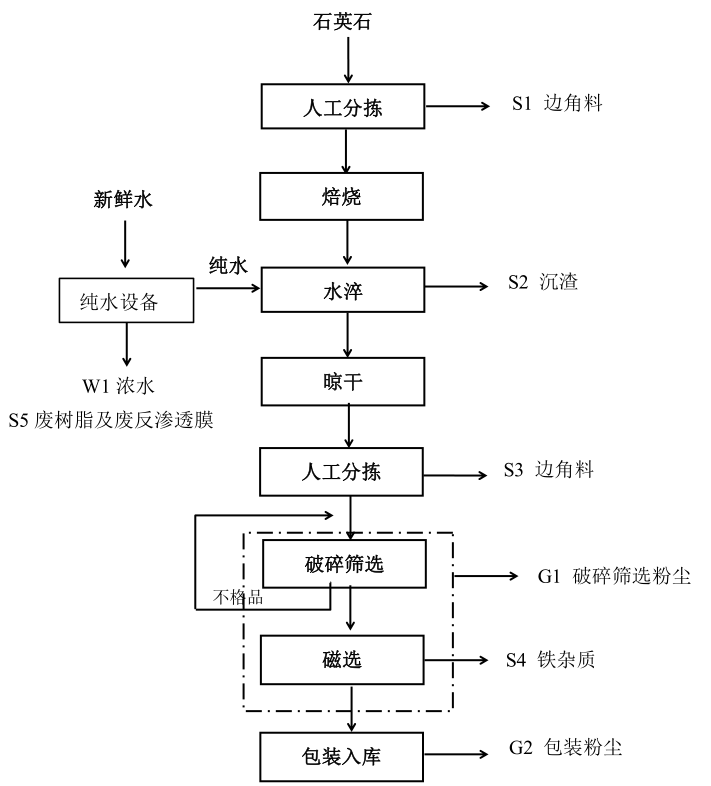 (6)破碎篩選:將分揀后的原料通過履帶輸送機(jī)運(yùn)往破碎機(jī)進(jìn)行進(jìn)一步粉碎,項(xiàng)目破碎篩選和磁選為一體化設(shè)備,設(shè)備操作過程密閉。破碎機(jī)粉碎后的石英砂通過振動篩篩分下來。