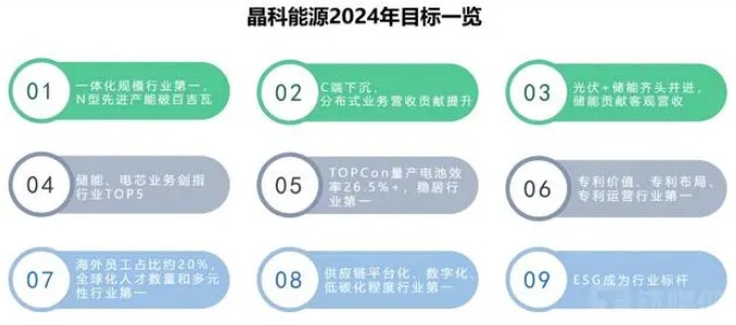 1月2日,光伏電池、組件龍頭晶科能源(688223.SH)官微發(fā)文披露了自身2024年的“小目標”。其中,第一條就是“一體化規(guī)模行業(yè)第一,N型先進產(chǎn)能突破100GW”。在業(yè)務層面,相關目標還有“分布式業(yè)務營收貢獻提升”“儲能貢獻可觀營收”“儲能、電芯業(yè)務劍指行業(yè)TOP5”等;在技術研發(fā)方面,主要目標有“TOPCon量產(chǎn)電池效率26.5%+,穩(wěn)居行業(yè)第一”“專利價值、專利布局、專利運營行業(yè)第一”;此外還有涉及全球化、供應鏈智能綠色升級、ESG等相關領域的目標。