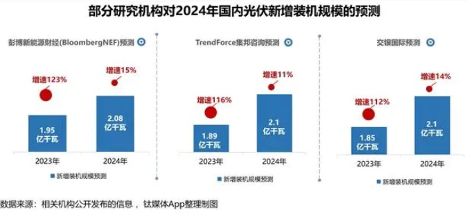 產(chǎn)能、技術之外,市場需求問題也是繞不開的話題,鈦媒體APP在此前的光伏產(chǎn)業(yè)展望中曾提及,多家機構均預測2024年我國光伏需求增速將大幅放緩,彭博新能源財經(jīng)、集邦咨詢、交銀國際的2024年新增裝機增速預測均未超過15%(2023年增速超過100%);而從全球來看,對光伏裝機增速的預測也從2023年的超過60%降為了2024年的普遍低于30%。
