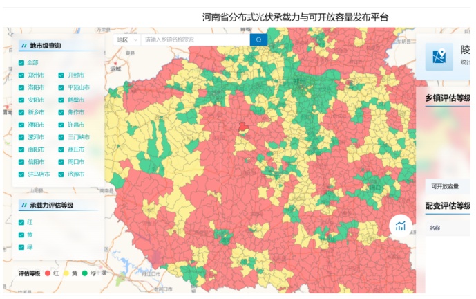其中,河南明確分布式光伏開發(fā)紅、黃、綠區(qū)域,按季度向社會(huì)公布,并適時(shí)縮短測(cè)算公布周期;優(yōu)先支持綠色區(qū)域內(nèi)的分布式光伏項(xiàng)目,黃色、紅色區(qū)域內(nèi)的分布式光伏項(xiàng)目,待落實(shí)消納條件后,再行開發(fā)建設(shè)。根據(jù)河南省能源大數(shù)據(jù)中心公布的情況,河南不同區(qū)域的承載力情況如下圖所示,河南整體上已經(jīng)處于紅黃狀態(tài),綠色區(qū)域較小。