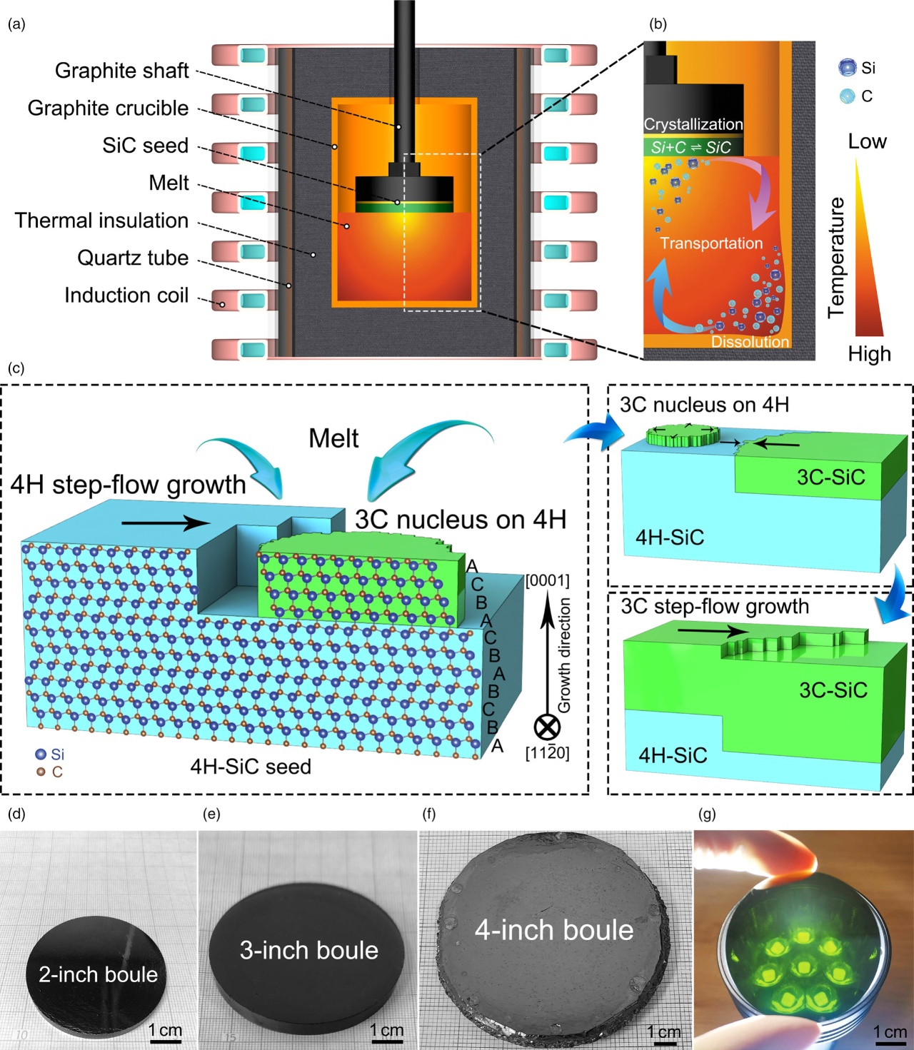 圖1. 采用高溫液相法,在六方碳化硅(4H-SiC)籽晶上實(shí)現(xiàn)了2-4英寸、厚度4-10 mm、立方碳化硅(3C-SiC)的異質(zhì)形核和晶體穩(wěn)定生長(zhǎng)
