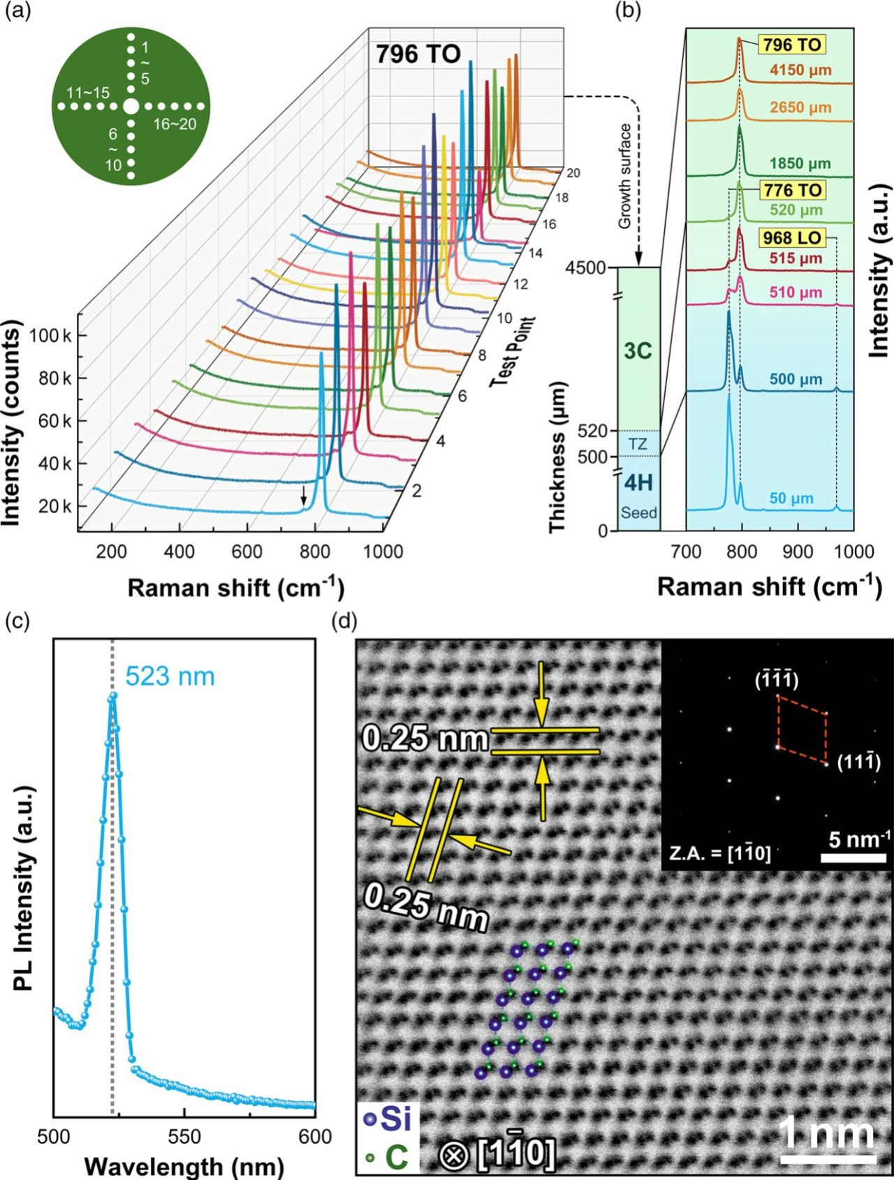 圖2. 3C-SiC晶型的確定。a) 在(111)生長(zhǎng)面上隨機(jī)選取20個(gè)點(diǎn)的Raman散射光譜圖,插圖為測(cè)試點(diǎn)在晶體上的位置分布圖。b) 沿晶體厚度方向的Raman散射光譜圖。c) 300 K測(cè)量的光致發(fā)光(PL)圖譜。d) 高角環(huán)形暗場(chǎng)掃描透射電鏡(HAADF-STEM)圖。插圖為沿[110]晶帶軸的選區(qū)電子衍射(SAED)圖晶圓級(jí)3C-SiC單晶的生長(zhǎng)填補(bǔ)了國(guó)內(nèi)外空白,使3C-SiC晶體的量產(chǎn)成為可能,也為開(kāi)發(fā)性能優(yōu)異的電力電子器件提供了新的契機(jī)。同時(shí),異質(zhì)籽晶上較同質(zhì)籽晶優(yōu)先形核和生長(zhǎng)的機(jī)制拓展了傳統(tǒng)的晶體生長(zhǎng)理論。
