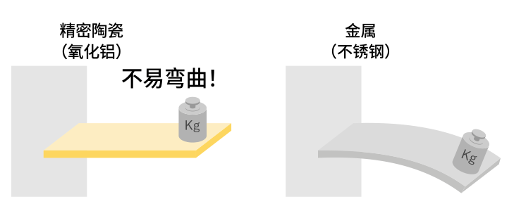 表面上講,剛度指抵抗彈性變形的能力。在材料上施加載荷,通過材料在該載荷下彎曲的變形量來表示剛性。材料的彎曲度越小,表示剛性越高,越不易變形。使用該方法檢測(cè)剛性時(shí),氧化鋁和碳化硅的數(shù)值相當(dāng)于不銹鋼的兩倍左右。