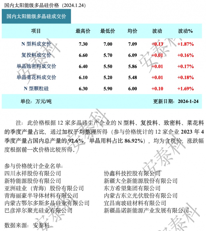 中國(guó)粉體網(wǎng)訊 1月24日,中國(guó)有色金屬工業(yè)協(xié)會(huì)硅業(yè)分會(huì)公布了太陽(yáng)能級(jí)多晶硅最新價(jià)格。