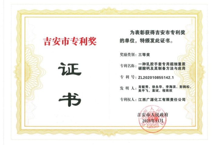 中國(guó)粉體網(wǎng)訊 近日,從吉安市委市政府、吉安市場(chǎng)監(jiān)督管理局傳來(lái)好消息,廣源集團(tuán)發(fā)明專利“一種用于增強(qiáng)增韌聚乳酸纖維的功能母粒及其制備方法和增強(qiáng)增韌聚乳酸材料”榮獲“2023年度吉安市專利二等獎(jiǎng)”;發(fā)明專利“一種乳膠手套專用超細(xì)重質(zhì)碳酸鈣及其制備方法與應(yīng)用”榮獲“2023年度吉安市專利三等獎(jiǎng)”。