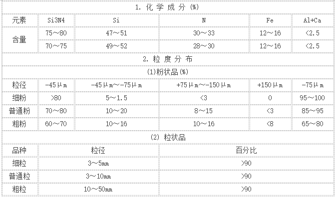 氮化硅鐵是以Si3N4為主要成分,伴隨游離鐵,為氮化硅鐵及少量其它成分的混合物。耐火用商品氮化硅鐵是一種灰白色(或茶褐色)的粉末狀物,煉鋼用氮化硅鐵是灰白色粒狀物。
