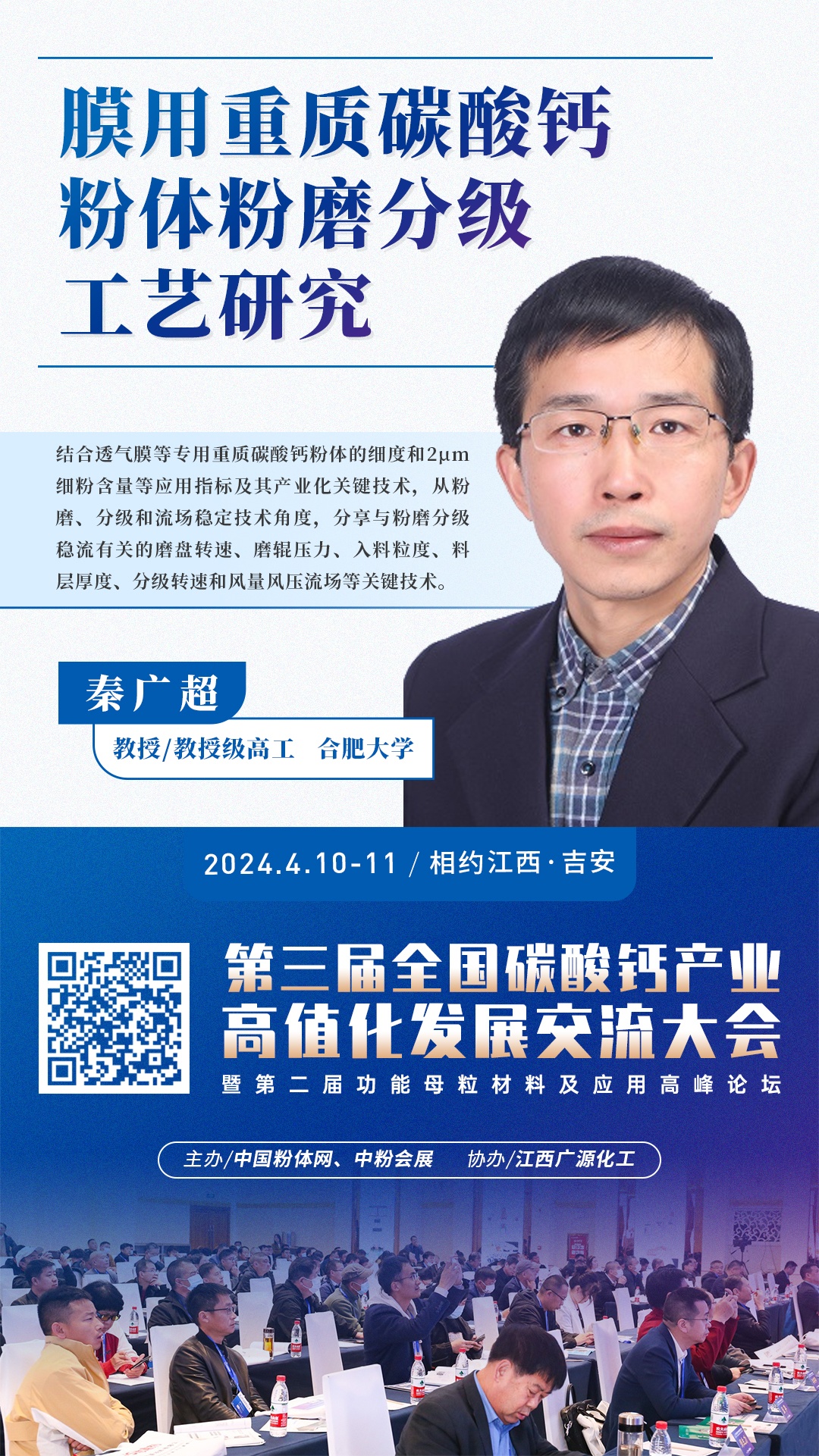 2024年4月10日~11日,第三屆全國碳酸鈣產(chǎn)業(yè)高值化發(fā)展交流大會將在江西·吉安舉行,屆時合肥大學秦廣超教授將在大會上作《膜用重質(zhì)碳酸鈣粉體粉磨分級工藝研究》主題報告,結(jié)合透氣膜等專用重質(zhì)碳酸鈣粉體產(chǎn)業(yè)化關(guān)鍵技術(shù),從粉磨、分級和流場穩(wěn)定技術(shù)角度,為大家做專業(yè)講解和匯報。