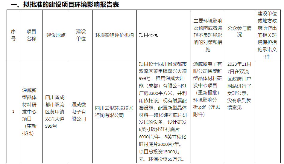 項目進展方面,成都市雙流生態(tài)環(huán)境局于2023年11月公示了通威新型晶體材料研發(fā)中心項目的環(huán)評文件,目前已通過審批。