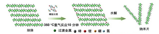 二維過渡金屬碲化物材料一般采用“自上而下”的制備方法,如同拆解積木,通過機械力或化學作用方式將其一層一層剝離下來,從而制備出單層的二維納米片。常用的“自上而下”方法有化學插層剝離法、球磨法、膠帶剝離法、液相超聲法等。其中,化學插層剝離法的剝離效率雖然最高但剝離需要數(shù)小時。科學家多采用有機鋰試劑作為插層劑,將含有鋰離子的插層劑插入塊體層狀結(jié)構(gòu)材料的片層中,并利用鋰和水的反應(yīng)使插層劑“膨脹”,在每一層間形成一個“氣壓柱”,將疊在一起的納米片層層“撐開”,猶如使用一把“化學刮刀”一層一層地將納米片“刮”下來。這種層間的氣體膨脹作用力大于機械剝離力,可以提高剝離效率。然而,有機鋰是易燃易爆的液體試劑,存在安全隱患。因此,實現(xiàn)安全、高效的化學剝離成為研究目標。