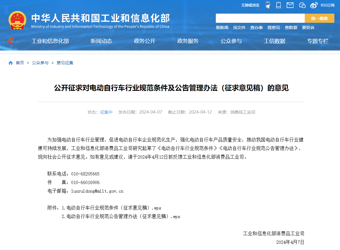 中國粉體網(wǎng)訊 2024年4月7日,工業(yè)和信息化部對《電動自行車行業(yè)規(guī)范條件(征求意見稿)》、《電動自行車行業(yè)規(guī)范公告管理辦法(征求意見稿)》公開征求意見,其中對電動自行車電池的質(zhì)量、制造、回收、安全等方面作出了相關(guān)規(guī)定。