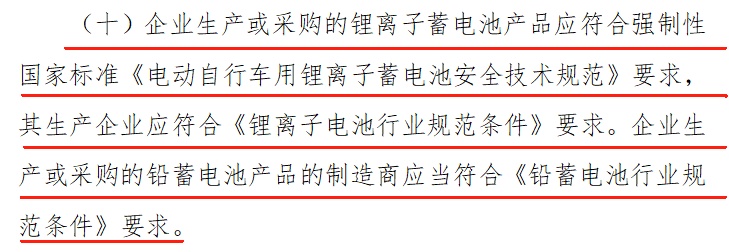 關(guān)于電動自行車電池,第十條做出規(guī)定,企業(yè)生產(chǎn)或采購的鋰離子蓄電池產(chǎn)品應符合強制性國家標準《電動自行車用鋰離子蓄電池安全技術(shù)規(guī)范》要求,其生產(chǎn)企業(yè)應符合《鋰離子電池行業(yè)規(guī)范條件》要求。企業(yè)生產(chǎn)或采購的鉛蓄電池產(chǎn)品的制造商應當符合《鉛蓄電池行業(yè)規(guī)范條件》要求。