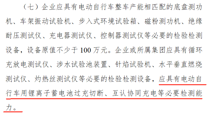 關(guān)于電池生產(chǎn)制造,第七條做出規(guī)定,電動自行車企業(yè)應具有電動自行車用鋰離子蓄電池過充切斷、互認協(xié)同充電等必要檢測能力。