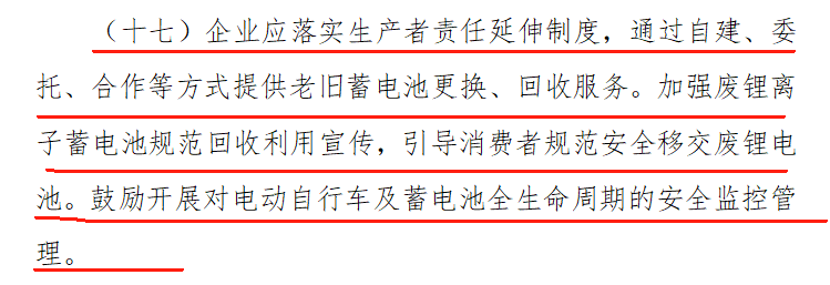 關(guān)于電池回收,第十七條做出規(guī)定,企業(yè)應落實生產(chǎn)者責任延伸制度,通過自建、委托、合作等方式提供老舊蓄電池更換、回收服務。加強廢鋰離子蓄電池規(guī)范回收利用宣傳,引導消費者規(guī)范安全移交廢鋰電池。鼓勵開展對電動自行車及蓄電池全生命周期的安全監(jiān)控管理。