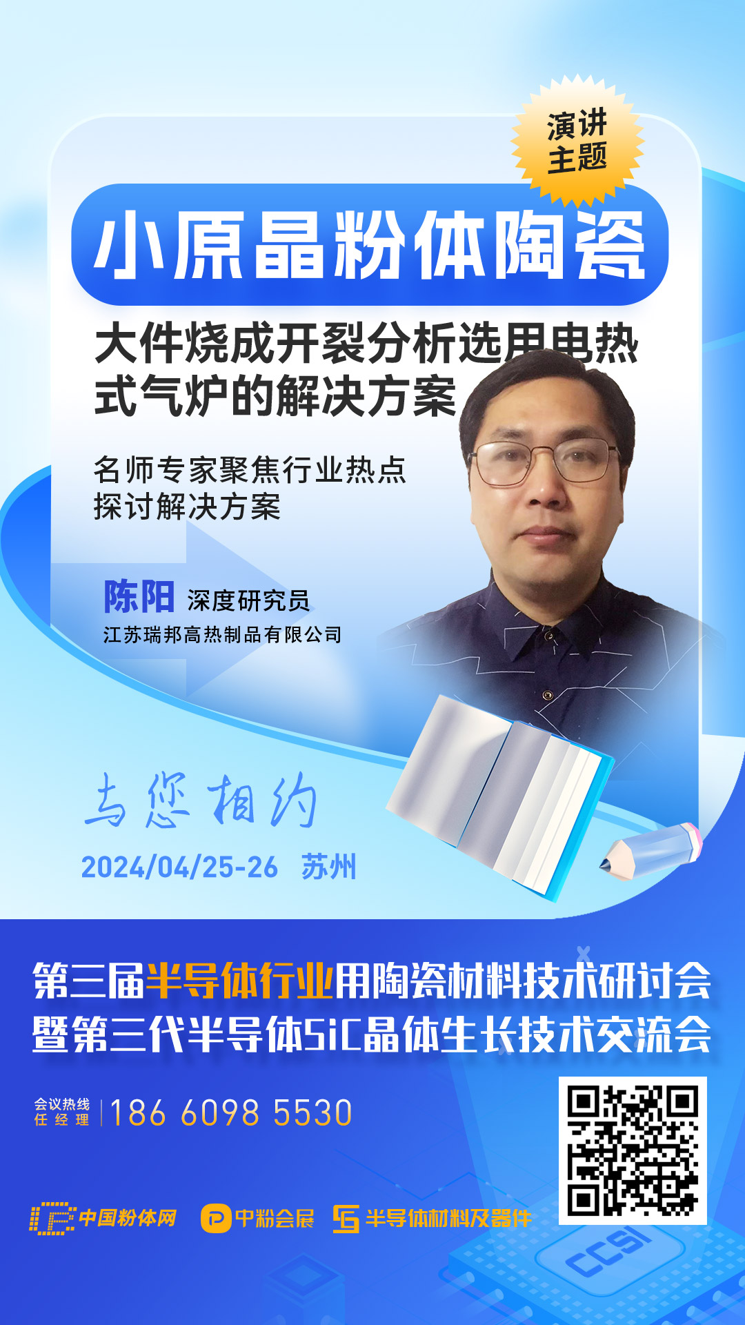 中國粉體網(wǎng)將于2024年4月25日在江蘇蘇州舉辦“第三屆半導(dǎo)體行業(yè)用陶瓷材料技術(shù)研討會暨第三代半導(dǎo)體SiC晶體生長技術(shù)交流會”,屆時,江蘇瑞邦高熱制品有限公司深度研究員陳陽將帶來《小原晶粉體陶瓷大件燒成開裂分析選用電熱式氣爐的解決方案》的報告,陳陽研究員將選用電熱式氣爐對小原晶粉體陶瓷大件燒成開裂的原因分析以及燒成效率作匯報。