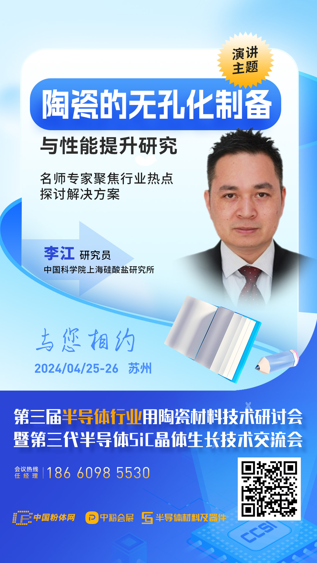 2024年4月25日,中國粉體網(wǎng)將在江蘇蘇州舉辦“第三屆半導(dǎo)體行業(yè)用陶瓷材料技術(shù)研討會暨第三代半導(dǎo)體SiC晶體生長技術(shù)交流會”,屆時,中國科學(xué)院上海硅酸鹽研究所研究員李江將帶來《陶瓷的無孔化制備與性能提升研究》的報告,李江研究員將重點介紹鎂鋁尖晶石、釔鋁石榴石、稀土倍半氧化物、氧化鋁、氧化鋯等幾類光學(xué)透明陶瓷的制備、性能與應(yīng)用。