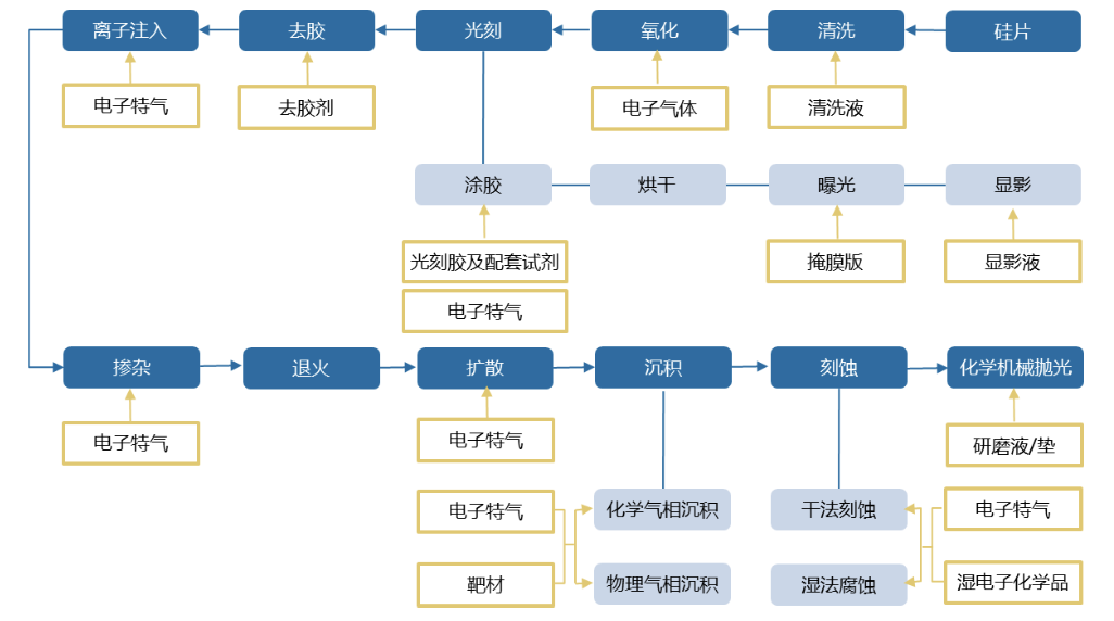 半導(dǎo)體材料是半導(dǎo)體產(chǎn)業(yè)鏈中細(xì)分領(lǐng)域最多的產(chǎn)業(yè)鏈環(huán)節(jié),晶圓制造材料可細(xì)化分為基體材料和制造材料。其中,基體材料主要用于制造硅晶圓或化合物半導(dǎo)體;制造材料包括光刻膠、光刻膠配套試劑、濕電子化學(xué)品、電子氣體、CMP拋光材料以及靶材等。芯片封裝材料包括封裝基板、引線框架、樹脂、鍵合絲、錫球以及電鍍液等。同時(shí)類似濕電子化學(xué)品中又包含了酸、堿等各類試劑,細(xì)分子行業(yè)多達(dá)上百個(gè)。