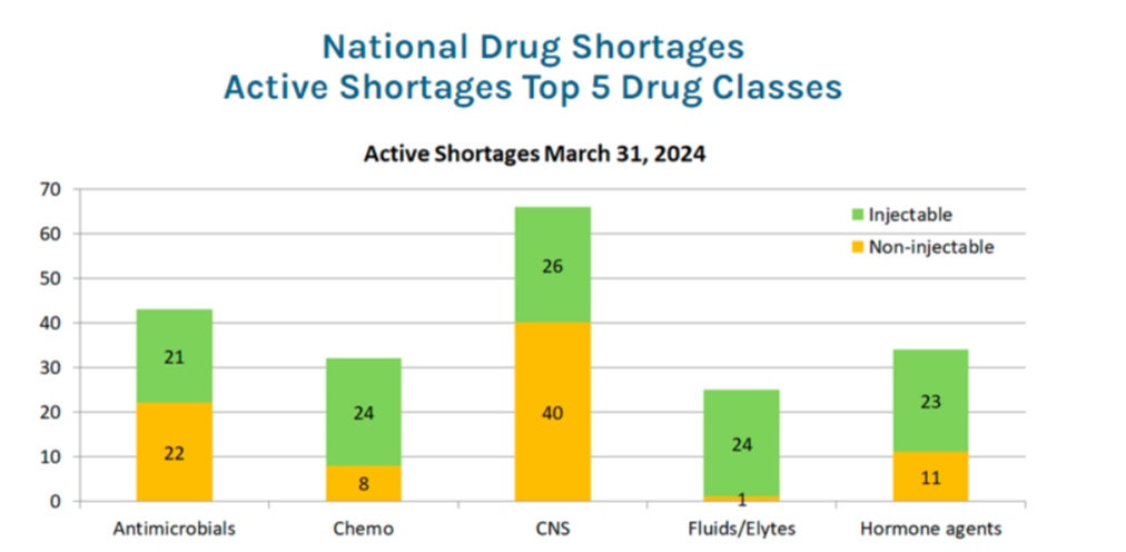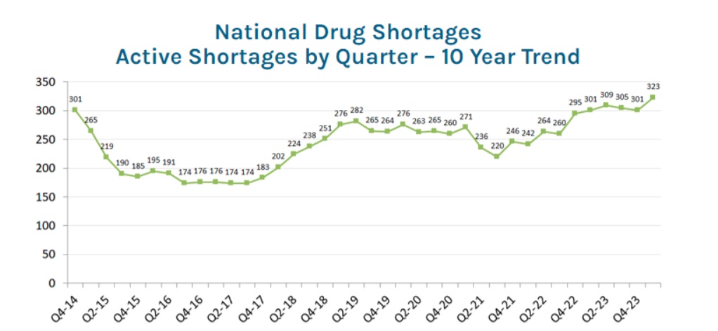 根據(jù)美國(guó)衛(wèi)生系統(tǒng)藥劑師協(xié)會(huì)(ASHP)和猶他州藥物信息服務(wù)中心的數(shù)據(jù),在2024年前三個(gè)月,全美有323種藥物處于短缺狀態(tài),這是ASHP自2001年開(kāi)始追蹤該調(diào)查以來(lái)的最高水平,超過(guò)了2014年時(shí)的320種藥物短缺。