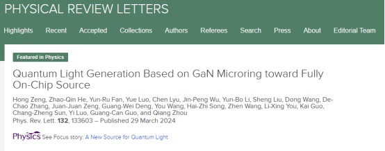 該成果以“Quantum Light Generation Based on GaN Microring toward Fully On-Chip Source”為題,發(fā)表在國際著名學(xué)術(shù)期刊《物理評論快報》上,并被選為“物理亮點”進行重點宣傳報道,天府絳溪實驗室為署名單位之一。