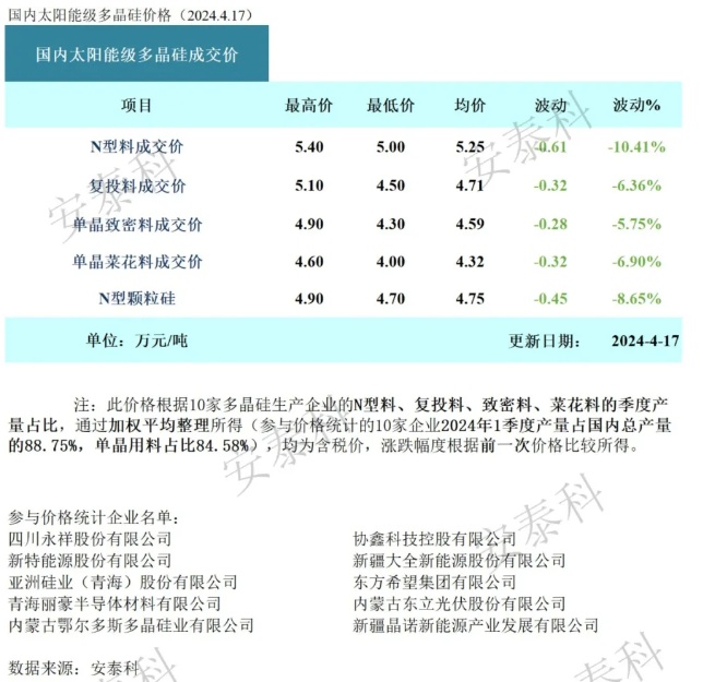 中國粉體網(wǎng)訊 根據(jù)硅業(yè)分會4月17日消息,本周硅料價(jià)格依舊呈持續(xù)下跌。