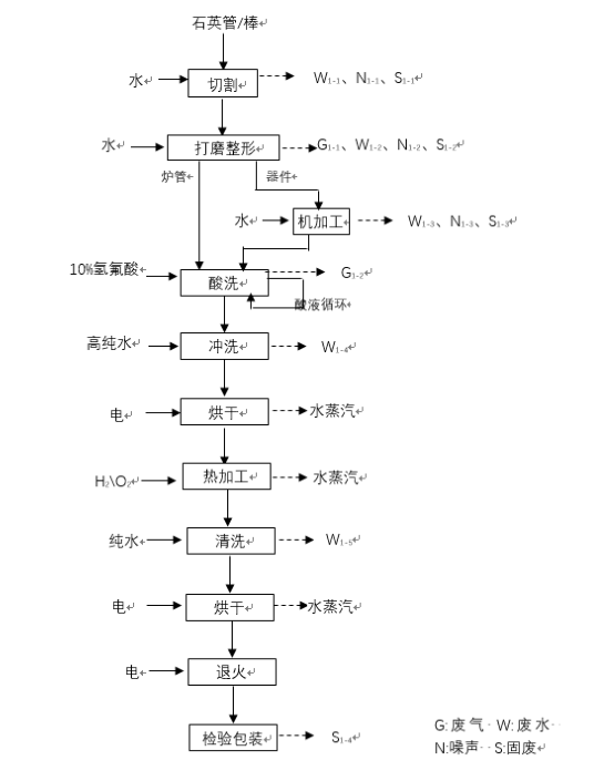 爐管采用石英管→毛坯切割、打磨整形→酸洗→高純水沖洗→烘干→熱加工→清洗→烘干→退火→檢驗包裝;石英器件采用石英管棒→毛坯切割、打磨整形→機械加工→酸洗→高純水沖洗→烘干→熱加工→清洗→烘干→退火→檢驗包裝工藝流程。