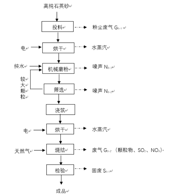 石英碇②采用石英砂→烘干→機械粉磨→篩選→澆筑→烘干→燒結(jié)→檢驗→包裝等工藝流程。