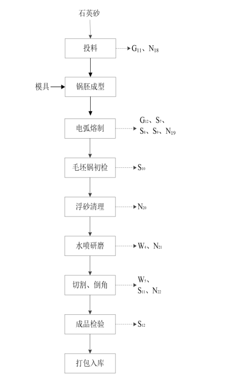 石英坩堝生產(chǎn)工藝流程為:投料、堝坯成型、電弧熔制、毛坯堝初檢、浮砂清理、水噴研磨、切割倒角、成品檢驗(yàn)、打包待售。
