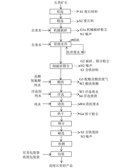 近日,東海生態(tài)環(huán)境局對連云港宏皓福石英制品有限公司年產(chǎn)3000噸高純石英砂技術(shù)改造項(xiàng)目環(huán)境影響評價受理情況進(jìn)行了公示。項(xiàng)目總投資6000萬元,采用石英礦石-初選-精選-機(jī)械破碎-焙燒水淬-細(xì)破碎篩分-酸洗-浮選-清洗-烘干--篩分-磁選-檢測-包裝等工藝生產(chǎn)高純石英砂。技改后產(chǎn)品產(chǎn)能為年產(chǎn)3000 噸高純石英砂。