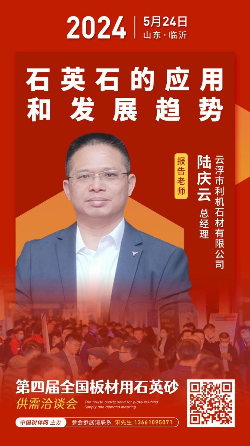 2024年5月24日,由中國粉體網(wǎng)主辦的第四屆全國板材用石英砂供需洽談會即將在山東臨沂召開,云浮市利機石材有限公司總經(jīng)理陸慶云將做《石英石的應(yīng)用和發(fā)展趨勢》的報告,屆時,他將對石英石的應(yīng)用和發(fā)展趨勢進行詳細解讀。