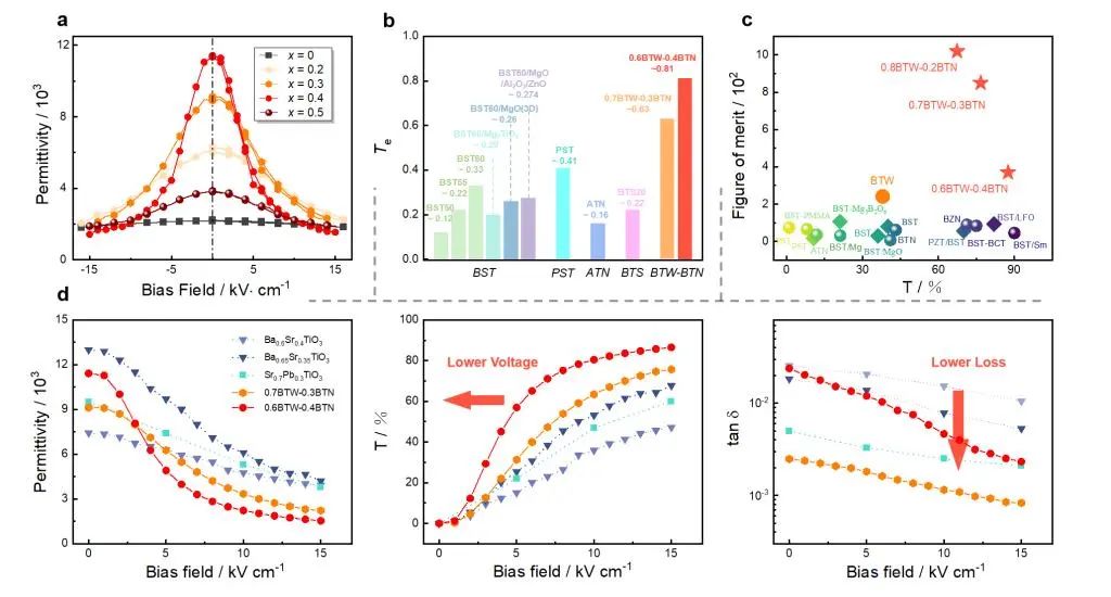 圖2.(1-x)Bi6Ti5WO22 -xBi6Ti4Nb2O22陶瓷同其他材料體系對比更為優(yōu)異的介電可調(diào)性能