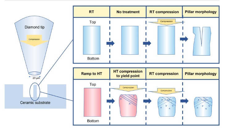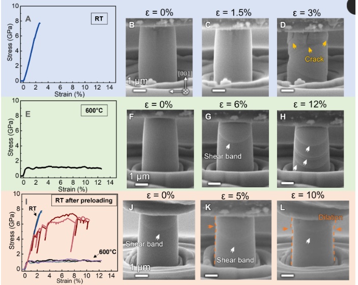 此前,該研究團(tuán)隊(duì)曾用閃速燒結(jié)增強(qiáng)釔穩(wěn)定氧化鋯等陶瓷材料的塑性,但該方法因其主要用于氧化物陶瓷而缺乏擴(kuò)展性。由預(yù)加載缺陷思路為指導(dǎo),研究團(tuán)隊(duì)引入包括位錯(cuò)和孿晶等高密度缺陷后,測(cè)試陶瓷微柱樣品,明確其可在室溫下實(shí)現(xiàn)相當(dāng)大的塑性。