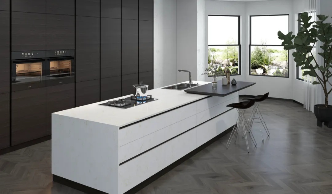 石英石本身的硬度高,不怕刮劃,也耐酸堿油污,很適合作為臺面使用。缺點是拼接做不到無縫,會有一些痕跡,但不影響美觀。無論是從性能、顏值、還是價格上,都十分平衡,性價比很高。